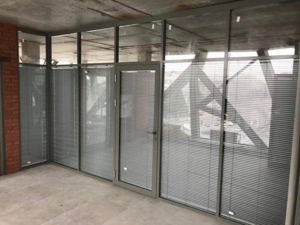 Противопожарные перегородки с двойным остеклением могут изготавливаться как в полностью остекленном варианте, так и в частично остекленном исполнении. Основное предназначение таких конструкций — это разделение общего помещения на несколько отдельных рабочих зон. При этом преследуется несколько целей: